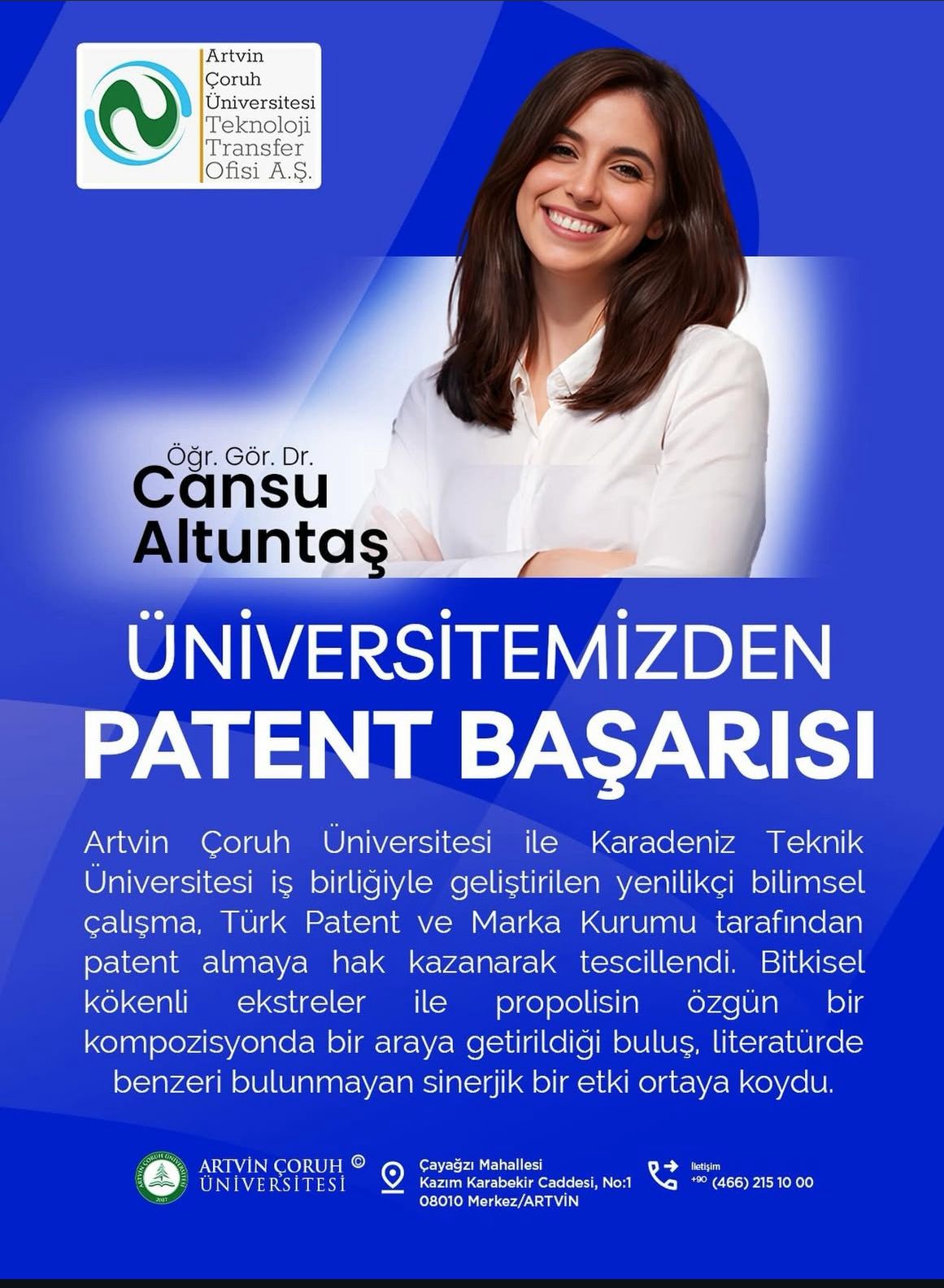 Üniversitemiz ile Karadeniz Teknik Üniversitesi İş Birliğiyle Geliştirilen Yenilikçi Bilimsel Çalışma, Türk Patent ve Marka Kurumu Tarafından Tescillenerek Patent Almaya Hak Kazandı Aralık 31, 2025 / Yazan Hasan Hüseyin Karataş Öğr. Gör. Dr. Cansu Altuntaş’ı tebrik ediyoruz.